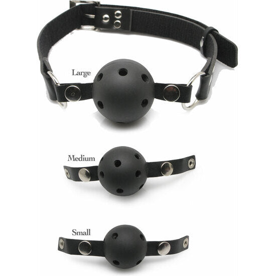 Cada bola é intercambiável com fechos, feita de plástico não tóxico e equipada com furos para facilitar a respiração. A pulseira de couro preto durável se ajusta facilmente à maioria dos tamanhos.